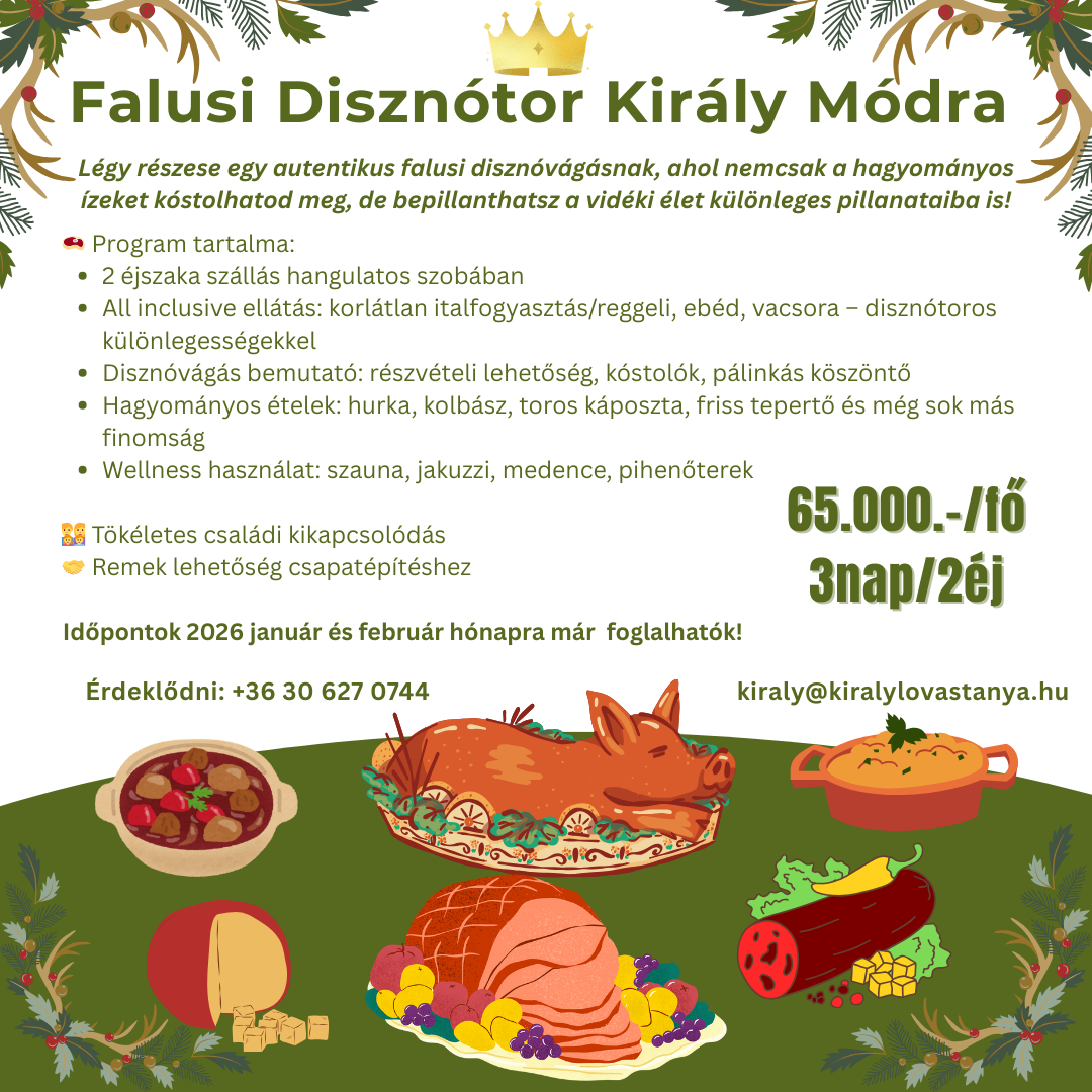 Elég volt a mókuskerékből és a nyüzsgő nagyvárosból? Lecserélnétek a kollégákkal a stresszes hétköznapokat és a hosszú megbeszéléseket? Ha igazi feltöltődést kerestek, akkor irány a Király Lovastanya, ahol a természet lágy ölén bográcsozhattok, finom borokat kóstolhattok, lovalgolhattok vagy wellnesselhettek!
